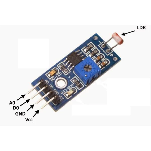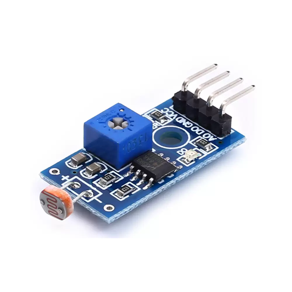 - Este módulo contiene una Fotorresistencia LDR, se utiliza principalmente como detector de luz, el pin de salida (DO) proporciona una salida digital, la cual es un 1 cuando se supera el límite del brillo de la luz establecido por medio del potenciómetro, y es un 0 cuando está por debajo del límite. La salida DO puede conectarse directamente a un microcontrolador. Compatible con Arduino.